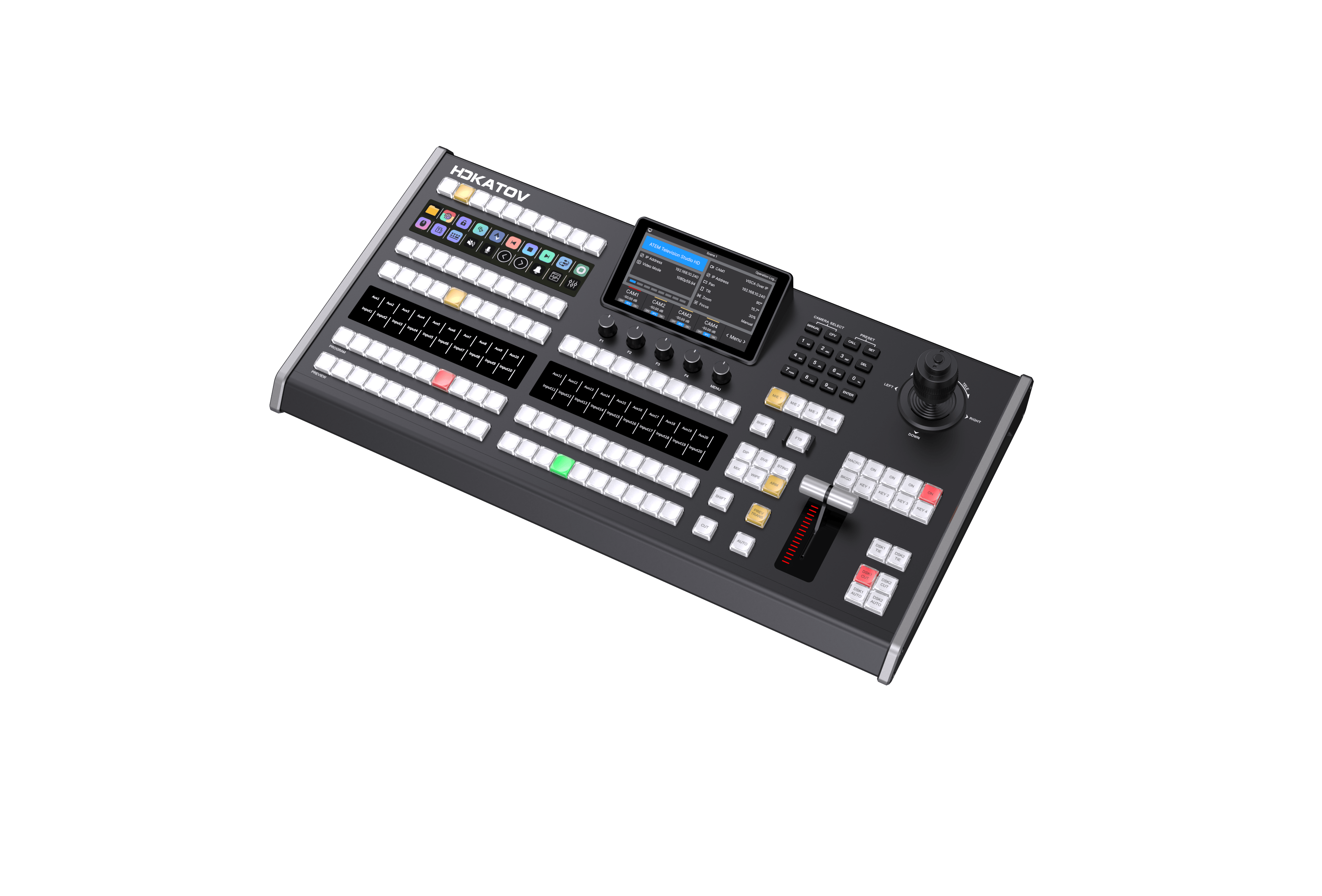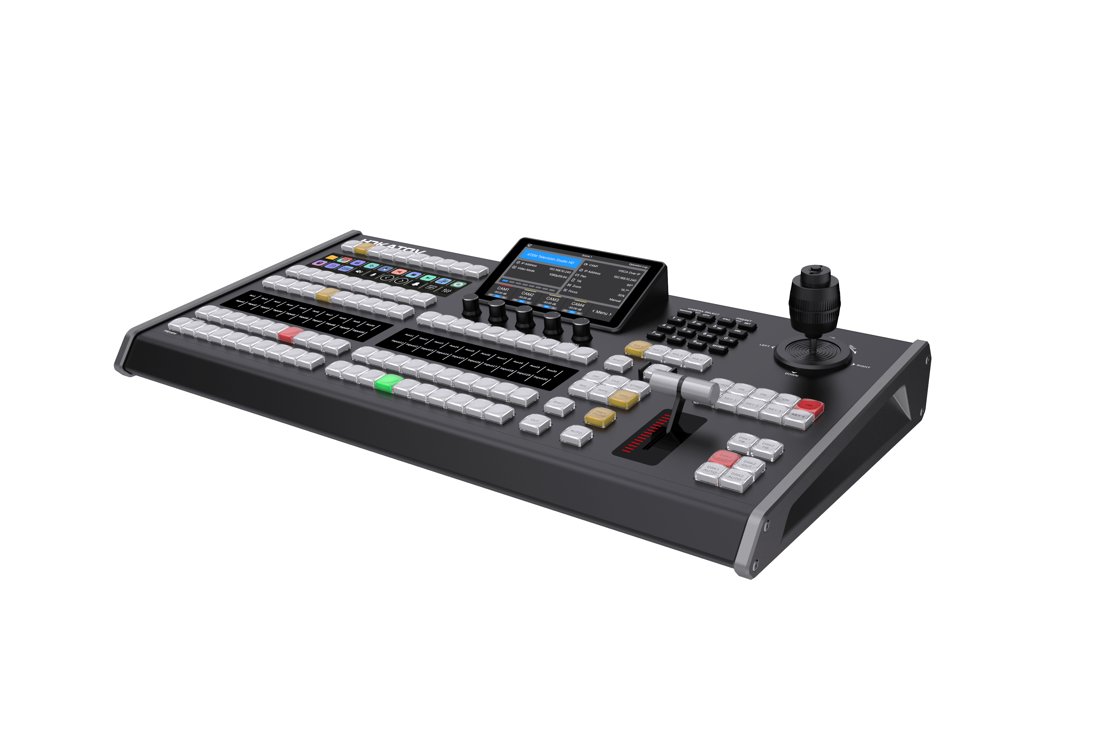 支持BMD ATEM的Constellation以及Television Studio系列1 M/E – 4 M/E產(chǎn)品的基本對(duì)應(yīng)功能操作,配合紅、綠和橙黃三色炫彩水晶按鍵,按鍵周邊帶有LCD顯示按鍵功能。